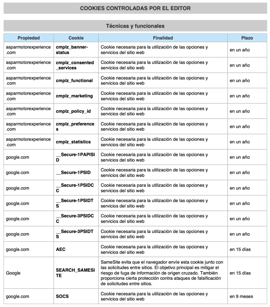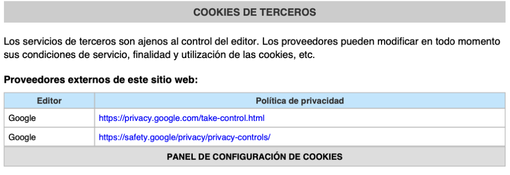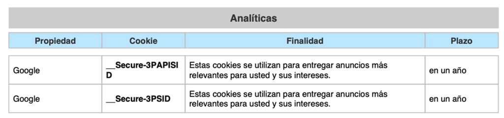 COOKIES UTILIZADAS EN ESTE SITIO WEB
